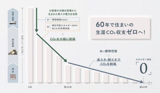 ※4.達成には当社規定の仕様の採用と、ヘーベル電気(earth-tect用)への20年間の加入が必要です。また、プランや仕様によっては達成の時期が前後する場合があります。LCCO2排出の考え方は、環境性能評価ツールであるCASBEE-戸建(新築)2018年版に準拠。一次エネルギー消費量はエネルギー消費性能プログラム(住宅版)により算定、ならびに、“LCCM低層共同住宅部門の基本要件(LCCO2)適合判定ツール2024年版 ver.2.0”を参照