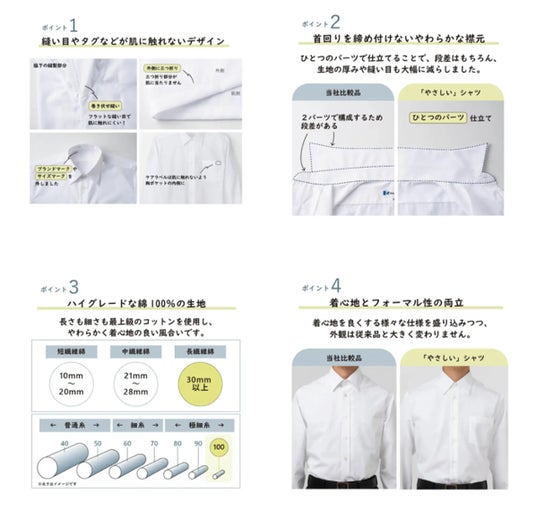 「やさしいワイシャツ」は感覚過敏の方をはじめ、敏感肌やアトピー肌、化繊アレルギーの方にも快適に着用していただけるよう、素材や縫製仕様、デザインに配慮したシャツです。近年の猛暑の影響により、5月頃から夏服が必要となる状況を考慮して、入学準備のタイミングで半袖も手にとっていただける体制を整えました。実際の商品の肌触りや仕様を、ぜひ店舗で直接体感していただきたいと考えております。
