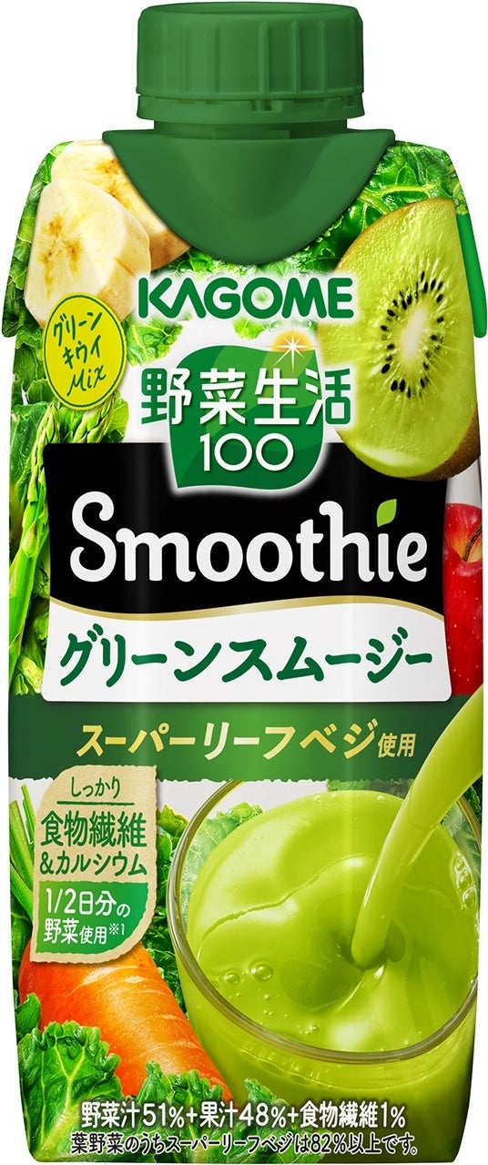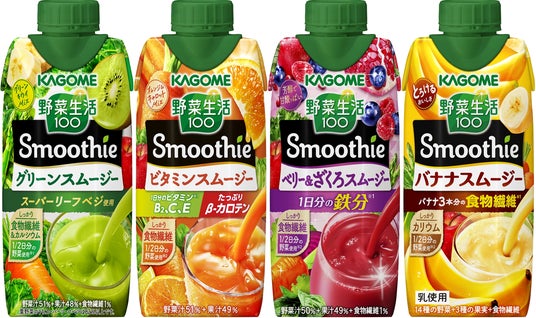 「野菜生活100 Smoothie」は、1本に1/2日分の野菜※2を使用。野菜不足をおいしく補っていただけます。「グリーンスムージー」はしっかりカルシウムと食物繊維、「ビタミンスムージー」は1日分のマルチビタミンと食物繊維、「バナナスムージー」はバナナ3本分の食物繊維※3、「ベリー&ざくろスムージー」は1日分の鉄分※4が摂れます。「野菜生活100 Smoothie」は砂糖を使用しておらず、カゴメ独自のブレンド技術で素材のおいしさを最大限に引き出しています。