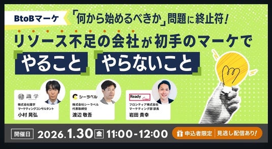 株式会社じげん(本社:東京都港区、代表取締役社長執行役員CEO:平尾丈、東証プライム:3679)が運営する、実名制レビューが特徴のツール・サービスレビューメディア『ミナオシ』(https://3naoshi.com/)は、2026年1月30日(金)に無料のオンラインセミナー『BtoB企業向け 「何から始めるべきか」問題に終止符! リソース不足の会社が初手のマーケで「やること」「やらないこと」』を開催します。