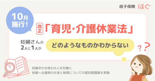 金融がもっと暮らしに寄り添う世の中を創るFinatextグループにおいて、細分化したニーズに応える次世代型デジタル保険“セグメント保険”を取り扱うスマートプラス少額短期保険株式会社(本社:東京都千代田区、代表取締役:小山 宏人、以下「当社」)の提供する『母子保険はぐ』は、2022年10月の改正「育児・介護休業法」施行に際し、妊婦さん926名を対象に『妊娠~出産時のお金と制度についての認知度調査』(以下「本調査」)を実施しました。