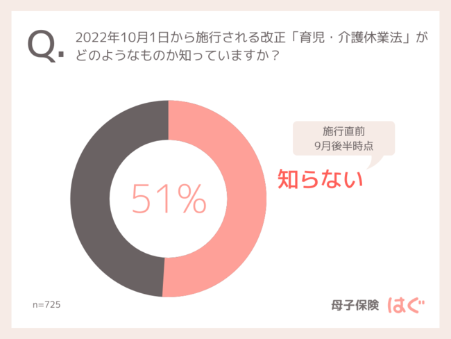 会社員(正社員)のパートナーを持つ妊婦さんの2人に1人(51%)が2022年10月1日から施行される改正「育児・介護休業法」がどのようなものか「知らない」(n=725)