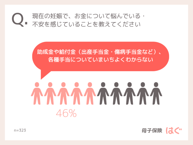 妊娠19週目までの妊婦さんの約半数(46%)が「(妊娠・出産時の)助成金や給付金(出産手当金・傷病手当金など)、各種手当についていまいちよくわからない」と回答(n=323)