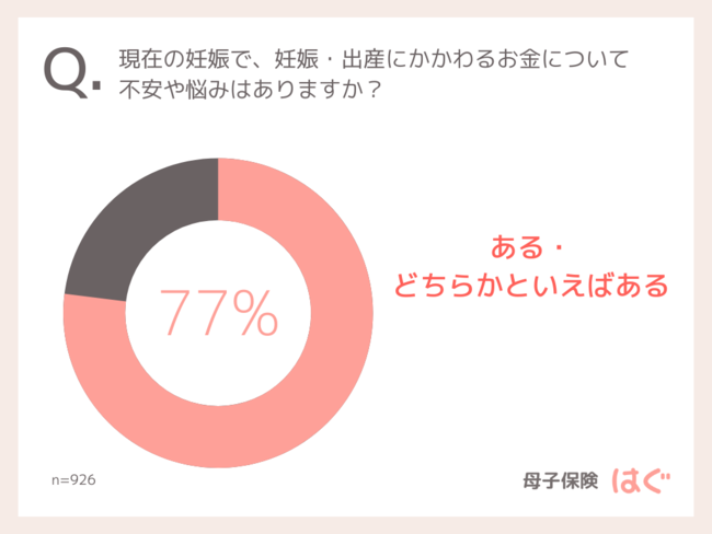 そもそも、妊婦さん全体の77%が「妊娠・出産にかかわるお金について不安や悩みがある」(n=926)