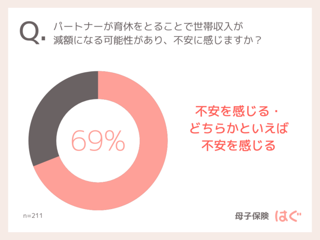 また、「知っている」と回答した妊婦さん(n=356)のうち、59%はパートナーが育休を取得しやすくなることに「期待している」「どちらかといえば期待している」と回答。一方で、「期待している」「どちらかといえば期待している」と回答した妊婦さん(n=211)のうち、「パートナーが育休をとることで世帯収入が減額になる可能性があり、不安に感じる」と回答したのは約7割(69%)と、全体の高い割合を占めています。