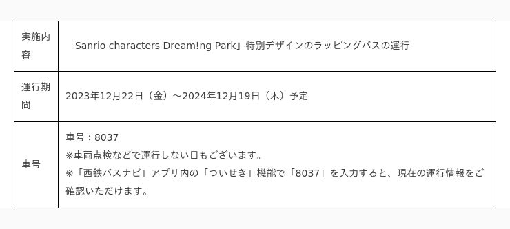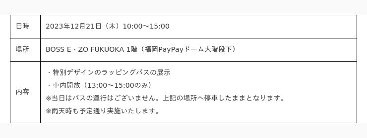 福岡ソフトバンクホークス株式会社(本社:福岡県福岡市 代表取締役社長 CEO:後藤芳光)は、12月21日(木)に福岡PayPayドーム隣の複合エンターテインメントビル「BOSS E・ZO FUKUOKA」7階に誕生する福岡初のサンリオのキャラクター施設「Sanrio characters Dream!ng Park(サンリオキャラクターズ ドリーミングパーク)」のオープンに合わせて、12月22日(金)より特別デザインの西鉄ラッピングバスの運行を開始することをお知らせします。