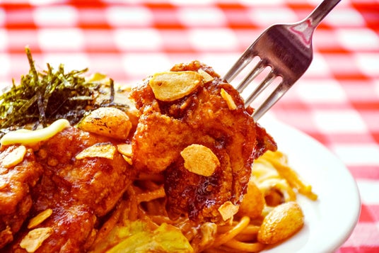 スパゲッティーもトッピングの鶏もも肉もバター醤油味、ゴロゴロ入った丸揚げにんにくがベストマッチ!