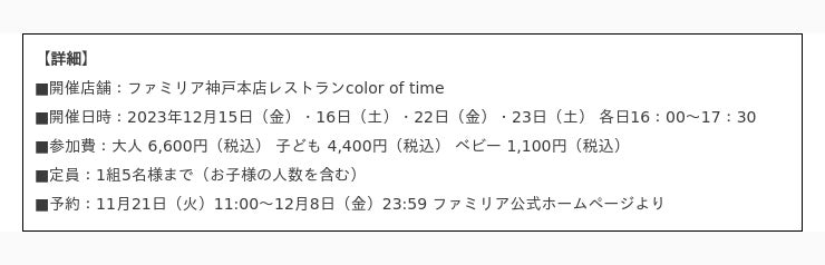 ファミリア神戸本店レストランcolor of timeでクリスマスティーパーティーを初開催!お子様から大人まで安心してお召し上がりいただける食材を使ったスイーツやドリンクをご用意。サンタの衣装に身を包んだファミちゃんとの記念撮影や、オーナメント作りのワークショップもお楽しみいただけます。ご家族でぜひ素敵なクリスマスをお過ごしください。