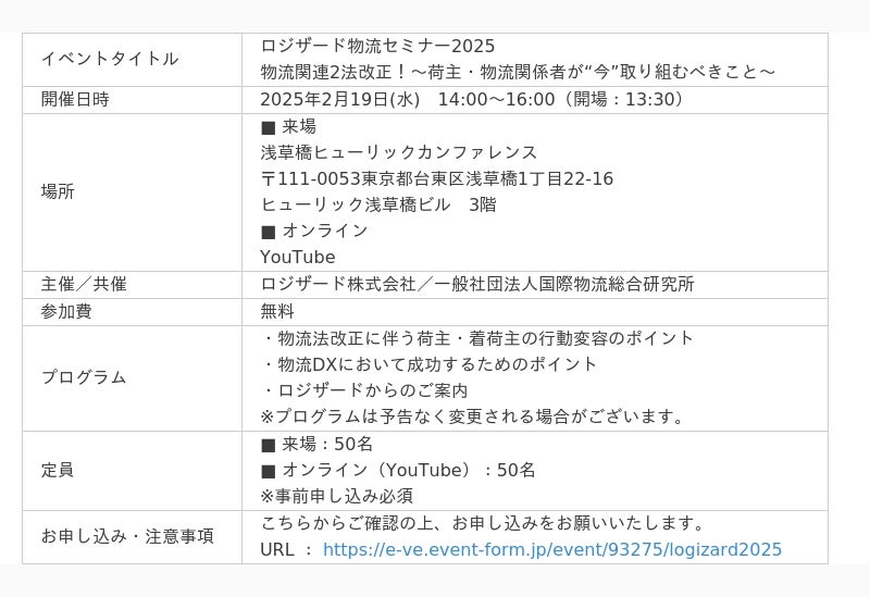 クラウド型在庫管理システムのリーディングカンパニーであるロジザード株式会社(東京都中央区、代表取締役社長:金澤 茂則、以下:ロジザード)は、一般社団法人国際物流総合研究所と共催し、『ロジザード物流セミナー2025 物流関連2法改正!~荷主・物流関係者が“今”取り組むべきこと~』を来場とオンラインのハイブリッド形式で開催を決定、申し込み受付を開始しましたのでお知らせいたします。