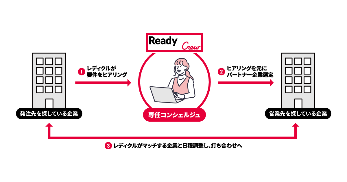 レディクルは、上場企業2,800社の利用実績がある企業と企業をつなぐビジネスマッチングエージェントです。高い傾聴力・提案力を併せ持つコンシェルジュが、システム、プロモーション他、企業のあらゆる発注業務に関わる悩みをヒアリングいたします。伺った内容を元に、レディクル独自のシステムで幅広いネットワークの中から最適な企業をご紹介いたします。受注先のパートナー企業様からのみ費用を頂いており、発注元の企業様からは一切費用を頂いておりません。