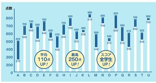 最大3ヶ月で80時間のレッスンを受講していただいた結果、21名のTOEICスコアは平均110点アップ!もっとも成果が出た方はなんと250点もアップしたという検証結果もございます。