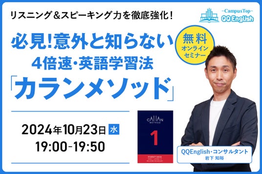 株式会社QQEnglish(本社:東京都渋谷区、代表取締役:藤岡頼光)は、2024年10月23日(水)19時から、QQEnglish英語コーチングのコンサルタントによる4倍速で習得できる英語学習法「カランメソッド」について、無料オンラインセミナーを実施することをお知らせいたします。