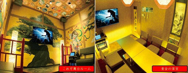 風神雷神を横目に威風堂々と歌える「これぞ舞台ルーム」や、茶をたしなみ心を整える「黄金の茶室」にて和とカラオケのマリアージュをお楽しみください。