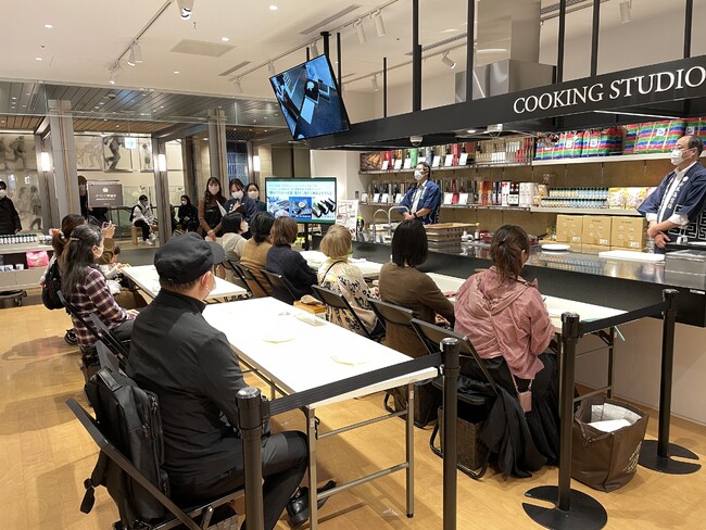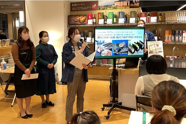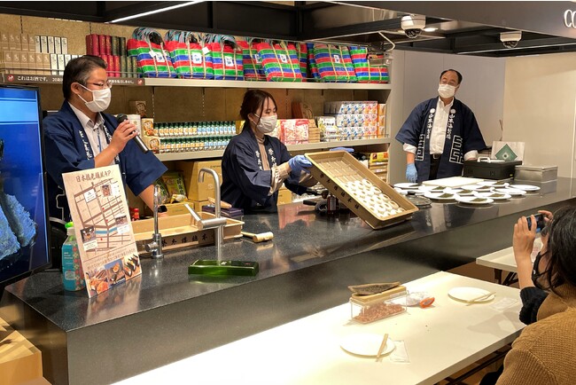株式会社にんべん(東京都中央区、代表取締役社長 高津伊兵衛)は、誠品生活日本橋の周年祭企画として、株式会社榮太樓總本鋪(東京都中央区、代表取締役社長 細田眞)、株式会社山本海苔店(東京都中央区、代表取締役社長 山本貴大)と共同で、3社のこだわり素材を使用した焼きたての「日本橋餅」をその場で味わっていただく体験イベント「削りたてのかつお節・焼きたて海苔で和菓子を作る会」を、2022年10月25日(火)に実施いたしました。