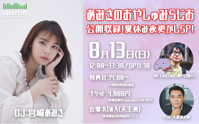 インターエフエム(東京:89.7MHz)は、女優・タレントの宮崎あみさがDJを担当する「あみさのおやしゅみらじお~公開収録!夏休み夜更かしSP!~」の公開収録イベント開催を決定しました。