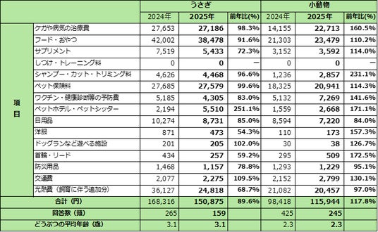 うさぎにかけた費用は150,875円(前年比89.6%)と減少しました。内訳では、ペットホテル・シッター費:前年比251.1%、治療費:前年比98.3%など、違いが見られました。