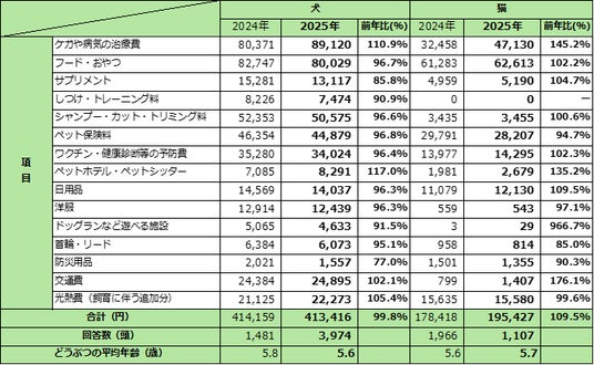 アニコム損保のペット保険「どうぶつ健保」の契約者に対し、2025年1月1日~12月31日の1年間にペット1頭へ支出した費用について、インターネット上でアンケートを実施。