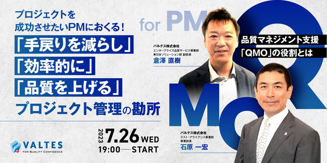 ソフトウェアのテスト・品質向上支援サービスを提供するバルテス株式会社(本社:大阪市西区、東京都千代田区、代表取締役社長:田中 真史)は、2023年7月26日(水)に無料Webセミナー「プロジェクトを成功させたいPMにおくる!『手戻りを減らし』『効率的に』『品質を上げる』プロジェクト管理の勘所-品質マネジメント支援「QMO」の役割とは-」を開催いたします。