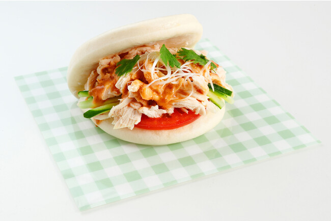 蒸したチキンに、唐辛子ベースのシラチャーソースを加えた深煎りごまドレッシングをかけました。パクチーを添え、ピリッと辛くエスニックな味わいに仕上げたキユーピーまんです。