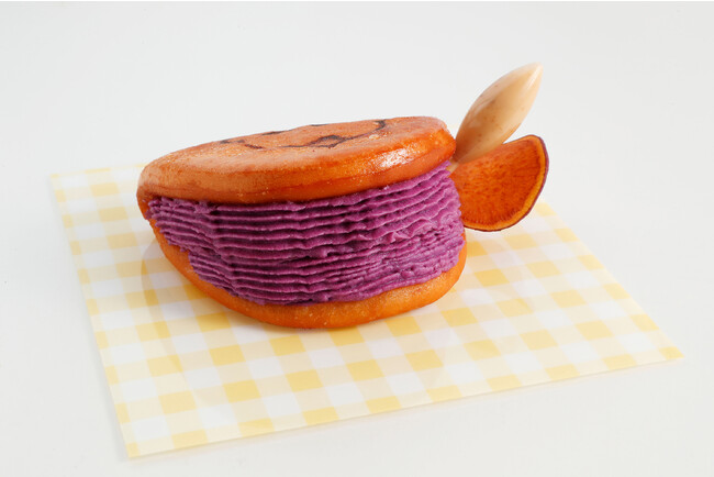色あざやかな特製紫芋クリームとバニラアイスを揚げたバンズで挟み、さつまいもチップスを飾りました。別添えの深煎りごまドレッシングをかけて仕上げます。甘じょっぱさが癖になるスイーツキユーピーまんです。