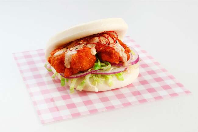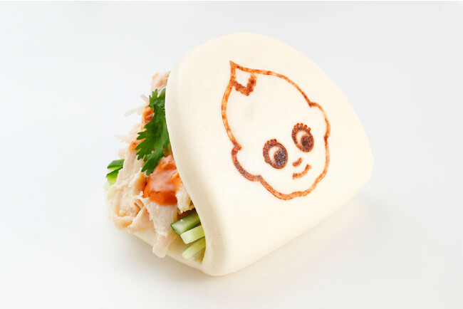 キユーピー人形の焼印を押したふわふわのバンズにさまざまな具材を挟み、深煎りごまドレッシングで仕上げています。