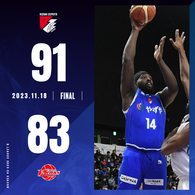 2023年11月18日(土)に開催されました【ライジングゼファーフクオカvs.熊本ヴォルターズ】において“福岡91-83熊本”の結果となりましたことお知らせいたします。