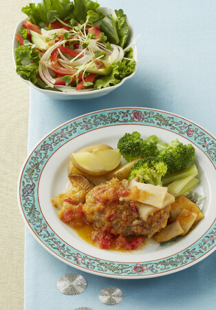 以前働いていたお店の賄い料理を簡単に作れるようアレンジ。ハンバーグのタネは、ひき肉だけでなくご飯を入れることで、ふわふわの食感に仕上げました。サラダのドレッシングは身体の内側から温めてくれる生姜を使用し、さっぱり食べられます。