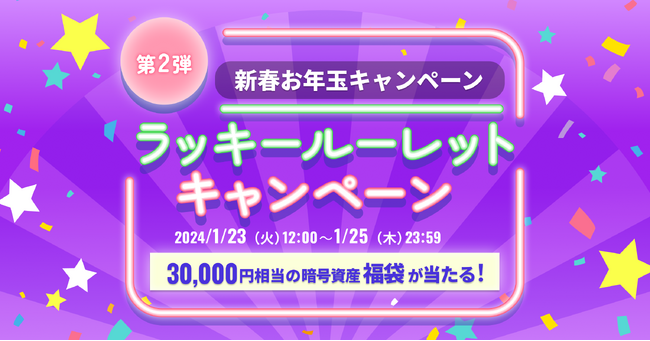 ビットトレード株式会社(所在地:東京都港区、代表取締役社長:関 磊、以下「ビットトレード」)は、1月23日(火)より、新春お年玉キャンペーン開催!第2弾、ラッキールーレットキャンペーンを開催いたします。