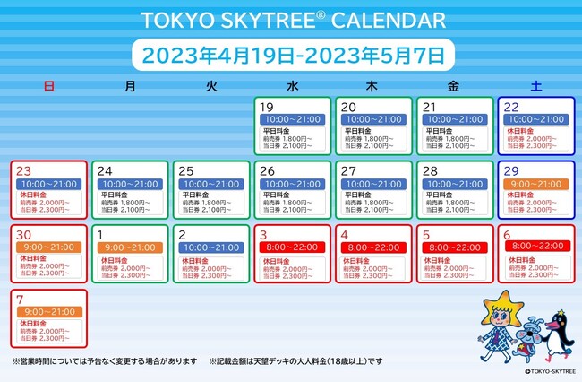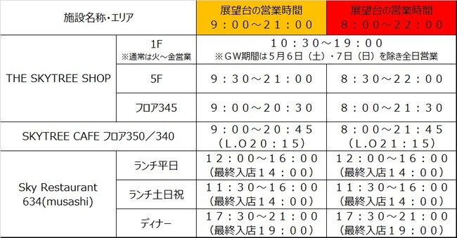 <GW期間における東京スカイツリーの営業時間 ※通常の営業時間10:00~21:00>