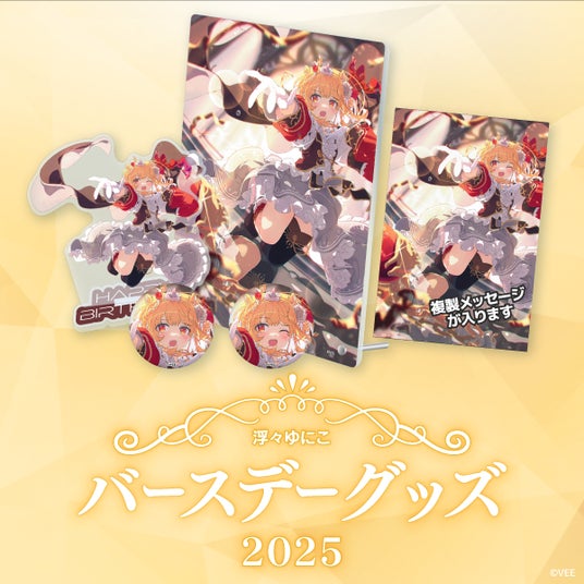 「浮々ゆにこ」のバースデーグッズは、アクリルパネルとアクリルスタンドと缶バッジ!公式オンラインショップ「VEE Official Shop」にて受注販売!
