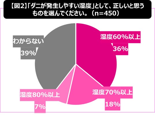一方で、ダニが発生しやすい湿度の目安については「わからない」と回答した人が最多となり、ダニが大量発生する危険ラインとされる「湿度60%以上」を正しく理解している人は限られていることが明らかになりました。【図2】
