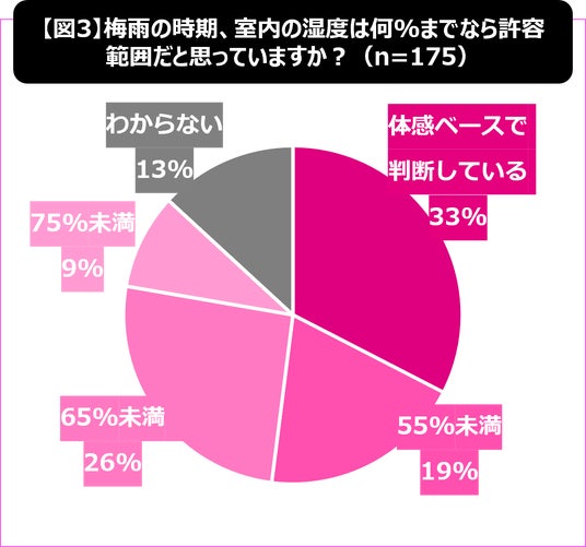 梅雨時期の室内湿度について「どこまでなら許容できるか」を尋ねたところ、「湿度55%」というダニが発生しづらい湿度でキープできている人は僅か19%。さらに、約3人に1人が「体感ベースで判断している」と回答しました。【図3】