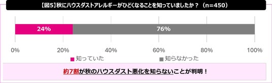 秋にハウスダストアレルギーが悪化しやすいことについて、「知らない」と回答した人が76%にのぼり、多くの人が秋にアレルギー症状が強まる可能性を認識していない実態が明らかになりました。【図5】