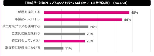 ダニ対策として実施していることについては、「部屋の換気」48%、「布製品の天日干し」44%が上位となり、手軽で昔ながらの効果が薄い方法に偏っている傾向が見られました。【図4】