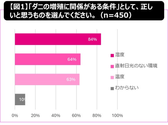 「ダニの増殖に関係がある条件」として、84%が「湿度」と回答しており、多くの人が湿度とダニの関係性そのものは認識していることがわかりました。【図1】