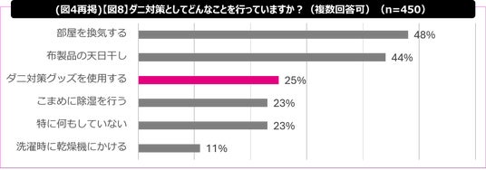 自宅でのダニの存在について、「家にダニがいると思う」と回答した人は約77%にのぼる一方【図7】、ダニ対策として「ダニ対策グッズを使用する」と回答した人は約25%【図8】と“気になってはいても専門的な対策ができていない”実態が浮き彫りになりました。