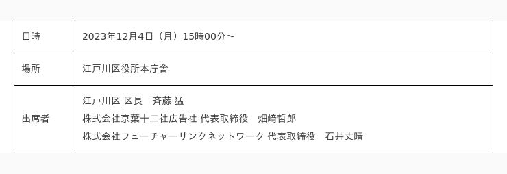 株式会社フューチャーリンクネットワーク(本社:千葉県船橋市、代表取締役:石井丈晴、以下FLN)は、東京都江戸川区(区長:斉藤 猛)、株式会社京葉十二社広告社(本社:東京都江戸川区、代表取締役:畑崎哲郎)と3者で「行政情報等発信に関する協定書」を2023年12月4日付で締結しました。「まいぷれ江戸川区」を通して、官民問わず様々な情報を地域の方にお届けしていきます。