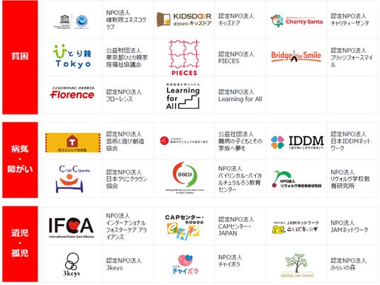 聴取した意見を基に最終的に決定した3つの分野「貧困※1」「病気・障がい※2」「遺児・孤児※3」に対する支援を行う以下、20団体に対し総額2,000万円(1団体:100万円)の助成金交付を行います。