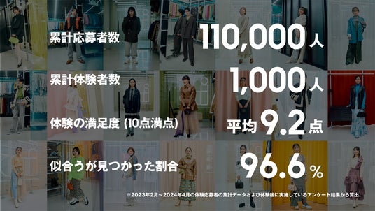 累計約1,000人の方々に体験いただきました。体験後のお客様アンケートでは、「体験の満足度」において10点満点中平均9.2点をいただき、96.6%の方に「似合うが見つかった」と言っていただきました。これらの結果から、ファッションの好みや悩みをふまえ「似合う」スタイリングを可視化することに対するお客様のニーズは、非常に高いということを確認できました。