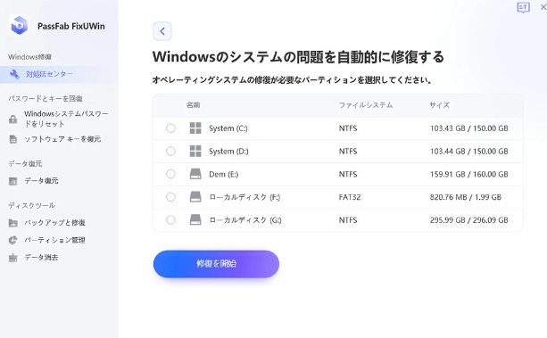 Step5:修復対象のパーティションを選択し、「修正を開始」をクリックします。