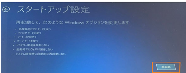 Step6:「スタートアップ設定」では画面右下の「再起動」を選択します。