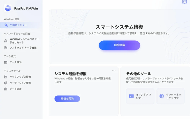 これまではWindows10が勝手に再起動してしまう原因について述べてきましたが、どのようにこの問題を解決できるのでしょうか。それでは、その対処法を紹介させていただきます。まずご紹介するのは専門ソフトを使う方法です。パソコンを修復する専門ソフトPassFab FixUWinはWindows のブルー/ブラック スクリーン、Windows が起動しない、PC がクラッシュし続けるなど、200 以上のWindows関連の問題を診断して修正できます。わずか3Stepで修復できるので、パソコンの初心者でも簡単に利用できます。