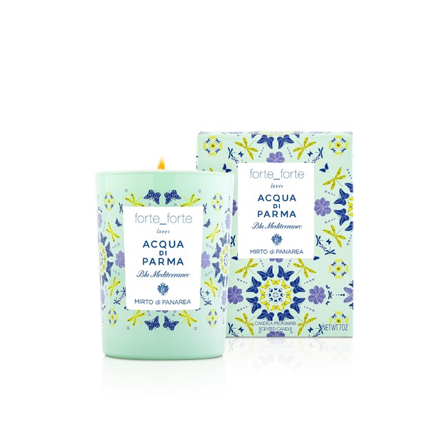 「forte_forte loves Acqua di Parma」 シリーズでは、 単品のフレグランスに加えて、 3種類のフレグランス( ミルト オーデトワレ、 アランチャ オーデトワレ、 フィーコ オーデトワレの12mLサイズ) を揃えたディスカバリー セットもご用意しています。 フォルテ フォルテのデザインを全面にあしらったボックスは、 イタリアの地中海地域らしい雰囲気を連想させます。 万華鏡のような花々と蝶のモチーフをグラスに散りばめ、 ボックスにエンボス加工したミルトの香りのセンティッドキャンドルはユニークなインテリアアイテム。 地中海沿岸の大自然に育まれた、 爽やかで目の覚めるような香りが家中に広がるでしょう。