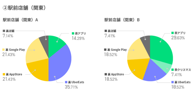 クリスマスメニューが多く読まれるエリア、グランドメニューが多く読まれるエリア、公式アプリへのアクセスが多いエリア、デリバリーが多いエリア、クリエイティブによる反響など、エリアにより読み込まれるコンテンツに差が発生した結果になりました。特に、駅前店舗ではデリバリー需要が高く、かつ関東ではUber Eats(35.7%)、関西では出前館(19.5%)が多く読み込まれるなど、同じ駅前店舗でも利用意向が異なることが判明しました。