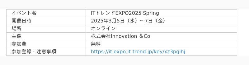 ITトレンドEXPO2025 Spring : https://it.expo.it-trend.jp/key/xz3pgihj