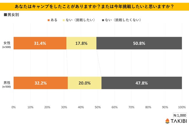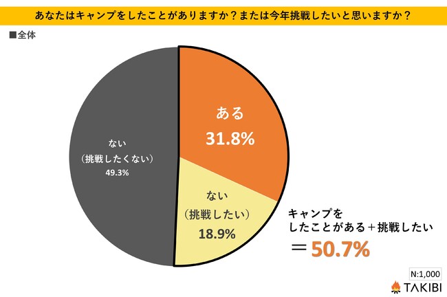 全国の10代~50代の男女1,000人を対象とした「あなたはキャンプをしたことがありますか?または今年挑戦したいと思いますか?」というアンケートを行ったところ、「ある」と回答した方が31.8%という結果になりました。また、「ない」が、「挑戦したい」という方は18.9%となっております。