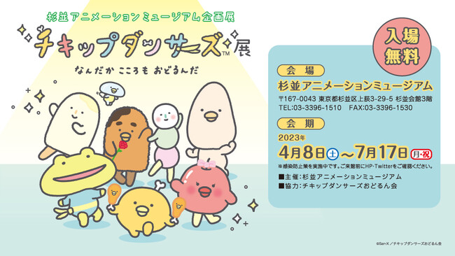 サンエックス株式会社(本社:東京都千代田区)は、「チキップダンサーズおどるん会(※)」製作アニメ「チキップダンサーズ」について、2023年4月8日(土)~7月17日(月・祝)の期間で、東京工芸大学 杉並アニメーションミュージアム第64回企画展『チキップダンサーズ展』が開催されることをお知らせします。テレビで放映されたアニメの全話紹介や、かわいいジオラマの展示をはじめ、企画が盛りだくさんです。
