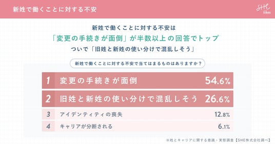 新姓で働く不安は「変更の手続きが面倒」が半数以上でトップ、ついで「旧姓と新姓の使い分けで混乱しそう」また、「アイデンティティの喪失」や「キャリアの分断」を不安視する人も一定数存在