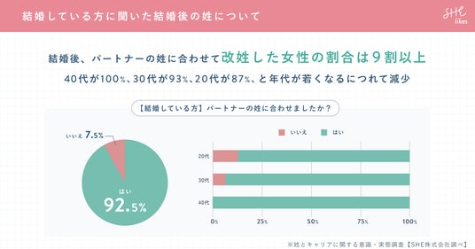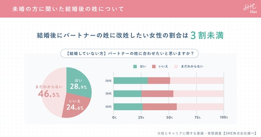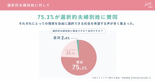 学ぶから働くまでをサポートする日本最大級の女性向けキャリアスクール「SHElikes(シーライクス)」を運営するSHE株式会社(所在地:東京都港区、代表取締役CEO:福田恵里、以下SHE)は、姓の多様性と女性のキャリアについて考えるきっかけとすべく、「選択的夫婦別姓に関する女性のリアルな本音調査」を、SHElikesで学ぶ女性を対象に実施しました。