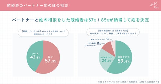 パートナーと姓の相談をした既婚者は57%、相談した人の85%が納得して姓を決定